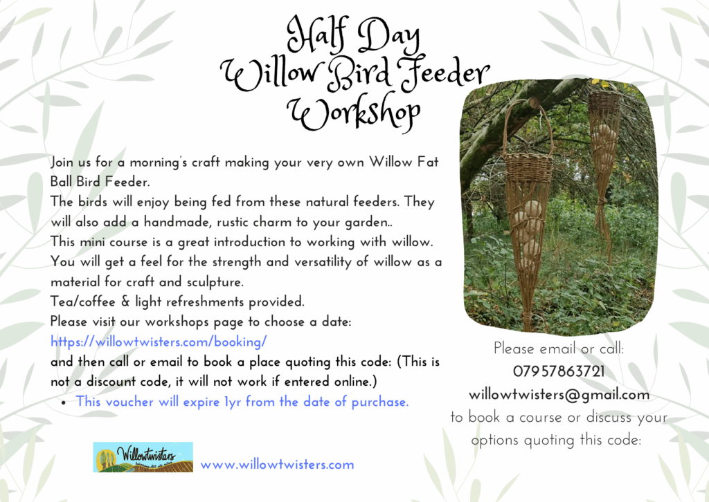 Purchase a gift voucher to use on any of our Willow Bird Feeder Workshops